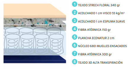 - Núcleo: 680 muelles ensacados recubiertos tejido TST + BOX HR 33 kg/m3 ensamblado con tejido TST superior e inferior+ plancha 2 cm ECONATUR alta densidad