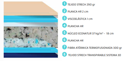 • Núcleo: ECONATUR densidad 37 kg/m3 de 18 cm + plancha HR alta densidad en ambas caras, garantizando una alta elasticidad y adaptabilidad a los movientos del descanso