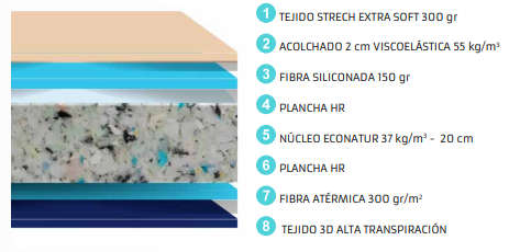 - Núcleo: ECONATUR densidad 37 kg/m3 de 20 cm + plancha HR alta densidad en ambas caras, garantizando una alta elasticidad y adaptabilidad a los movientos del descanso